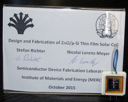 دانشجویان بین المللی پژوهشگاه مواد و انرژی به نام های اشتفان ریشتر و نیکولای لورنز میر که از کشور آلمان جهت انجام دوره کوتاه مدت تحقیقاتی به پژوهشگاه آمده بودند، موفق به ساخت سلول خورشیدی مبتنی بر لایه نازک شدند.