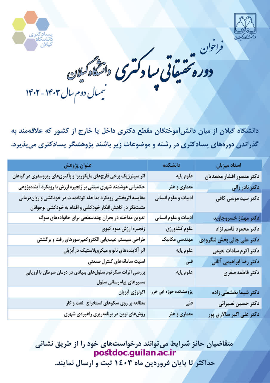 اخبار تحصیلات تکمیلی 25 فروردين 1403 جهت دریافت پوستر فراخوان دوره تحقیقاتی پسادکتری دانشگاه گیلان اینجا کلیک کنید.